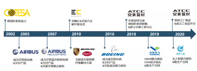 安泰复材于2018年5月份完成对COTESA GmbH的全资收购。基于COTESA GmbH近二十年的技术积累,安泰复材坚持“引进、消化、吸收再提升”的集成创新战略路线,通过建设科泰思中国交付中心和中德联合工程技术中心,快速实现了碳纤维复材关键核心技术转化吸收。目前已成功参与国产大飞机(C919、CR929)项目以及国内各类无人机项目,在中国国内航空复合材料结构件市场异军突起。