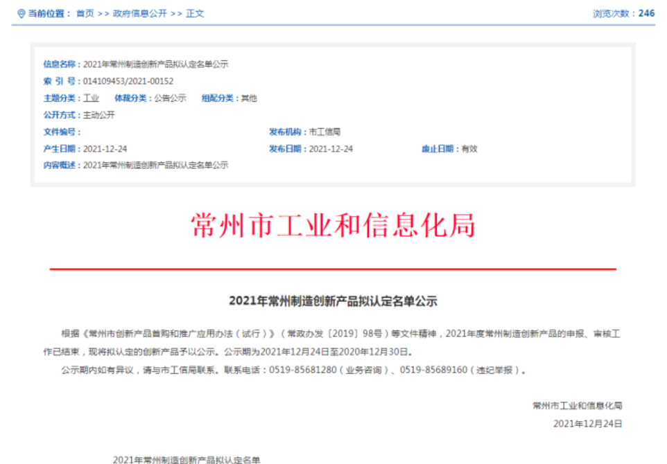捷报 | 安泰复材申报产品入选2021年常州制造创新产品拟认定名单!
